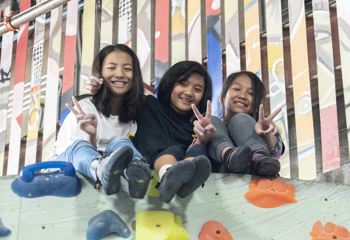 Cing Kim, Cing Lun, and Cing Sung at the top of the bouldering wall.