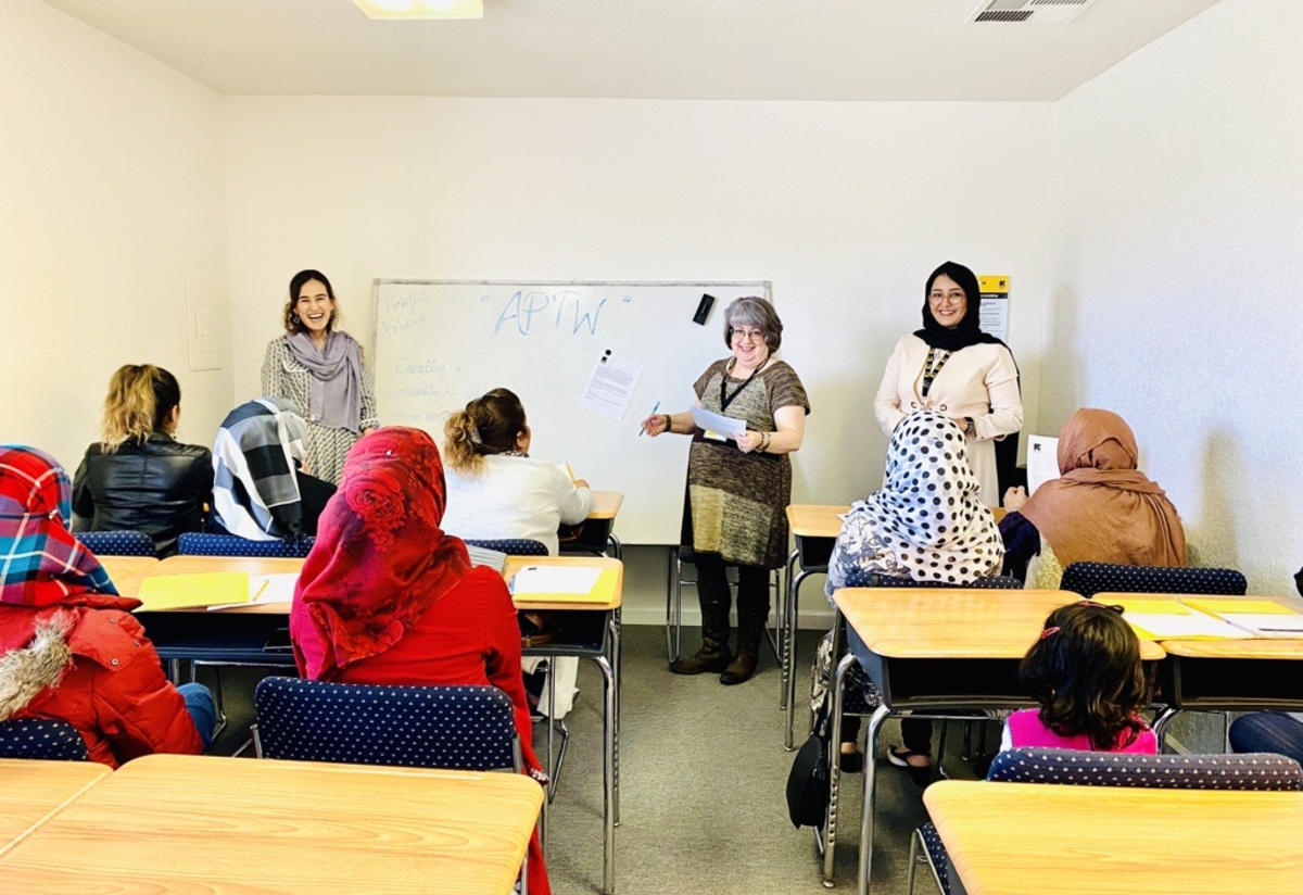 APTW’s Dari-speaking community health promoters, Sima Qaderi and Farishta Sadaat, teach courses to Afghan refugee participants on topics such as culture shock, mental health, the mind-body connection, and creating wellness. Michelle Riley, a licensed clinical social worker, assists with mental support for those who need it, and Peets manages the program and helps clients access the health and wellness services that they need.