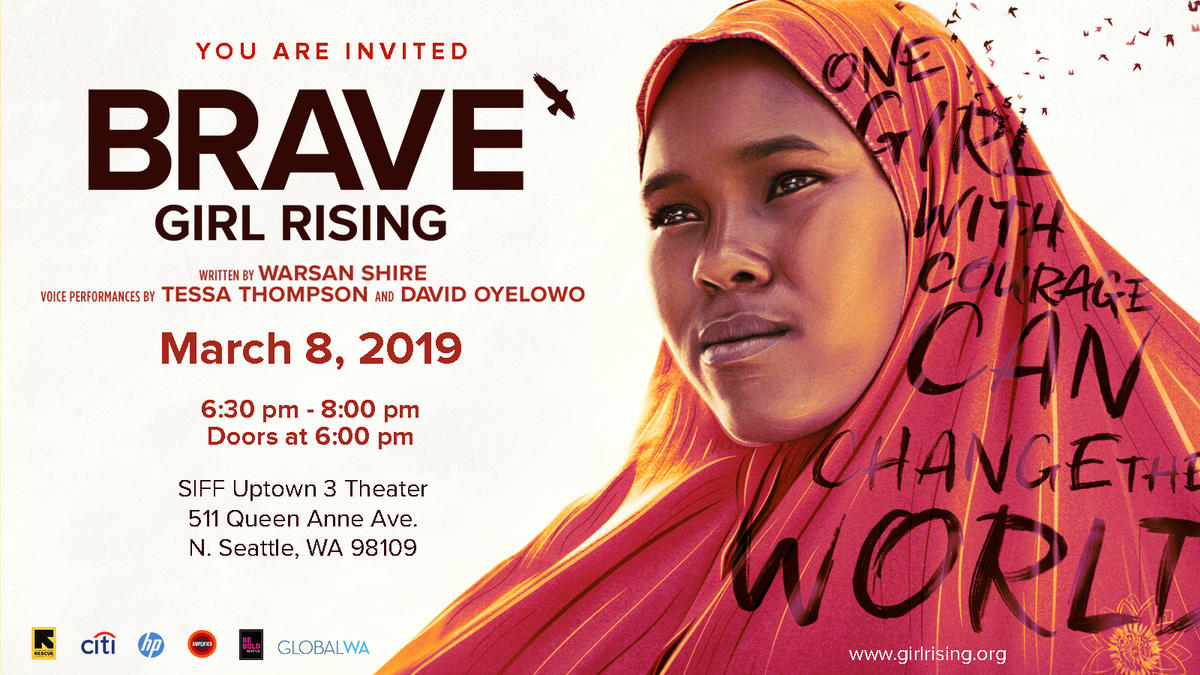 The International Rescue Committee, in collaboration with Girl Rising, Citi, and HP, will debut the new short film Brave Girl Rising on International Women’s Day. Join us for the film premiere hosted by Global Washington and Girl Rising, followed by a panel discussion featuring Nicky Smith, Executive Director of IRC Seattle, and Christina Lowery, CEO of Girl Rising. Additional panelists to be announced.