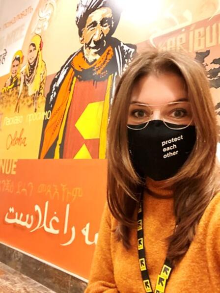 Alex takes a selfie in front of a mural at the IRC in Baltimore. Photo: Alex Weidt