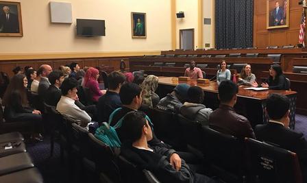 The final stop of the day was a visit tothe House Committee on Foreign Affairs, kindly organized by Jacqueline Colvett, the Committee’s Digital Communications Manager. Students packed into the hearing room to speak with Chief Counsel, Janice Kaguyutan, and a panel of staff. The panel answered questions about the committee’s top priorities, recent hearings and their personal college and career paths. Ms. Kaguyutan also shared about the important role that she played in establishing the Special Immigrant Visa program during her time under late Senator Kennedy. “So many eyes lit up in the room once we found out she helped legislate the SIV laws that enabled many of our students and their families to come to America,” shared Tarlan Faal, an IRC Youth Development Intern and junior at the University of North Texas.