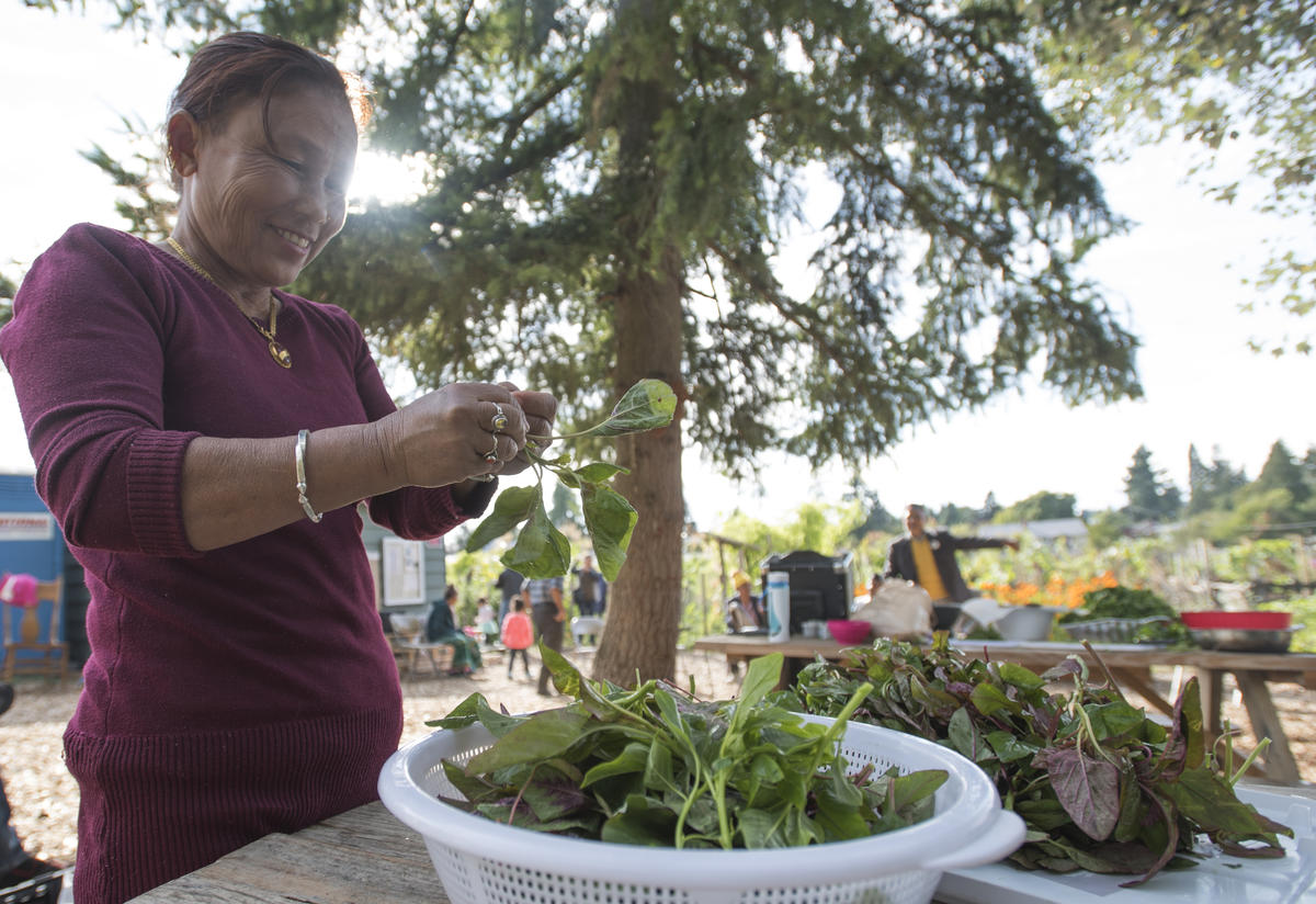 Harvesting fresh greens from the Namaste Garden in Tukwila.