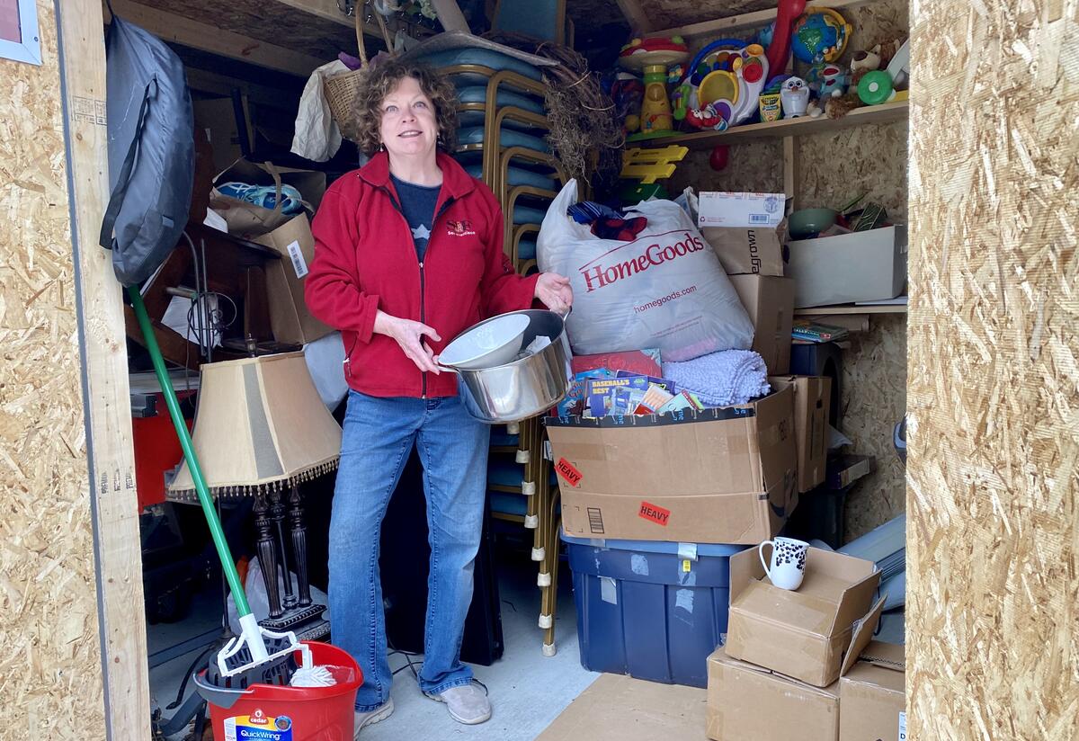 Peggy stands before her beautiful resettlement shed, ready to be filled to the rafters with donations for newly arrived refugee families.