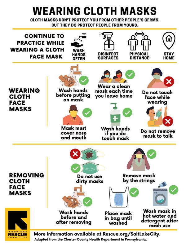 We partnered with IRC Salt Lake City to translate physical distancing guidelines & cloth face mask guidelines into 6+ different refugee languages!