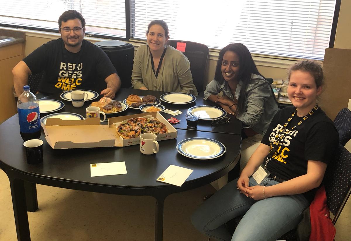 From left, IRC volunteer Dorian Hostain from the University of Poitiers in France is seated with IRC Turlock/Modesto economic empowerment staff members Katharina Beeler and Meseret Ghirmai and fellow University of Poitiers volunteer Seleyna Milliot.