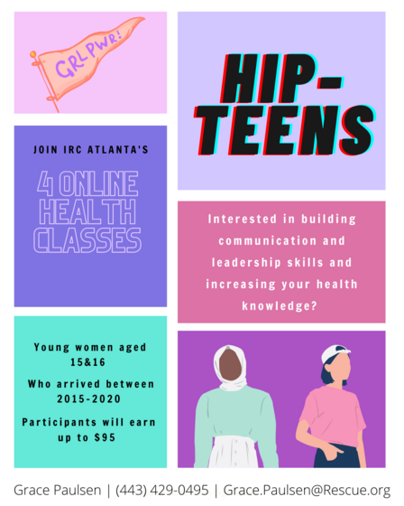 The IRC in Atlanta is looking for refugee and immigrant young women age 15 and 16 who arrived in the U.S. between 2015 and 2020 to join our HIP-Teens online health program. Participants will build communication and leadership skills, increase their health knowledge and can earn up to $95. If you or anyone you know is interested, please contact Grace Paulsen at Grace.Paulsen [at] Rescue.org or (443) 429-0495.