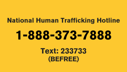 To report suspected human trafficking or to obtain resources for victims, please call 1-888-373-7888; text “BeFree” (233733), or live chat at HumanTraffickingHotline.org. The toll-free phone, SMS text lines, and online chat function are available 24 hours a day, 7 days a week, 365 days a year. Help is available in English, Spanish, Creole, or in more than 200 additional languages.  The National Hotline is not managed by law enforcement, immigration or an investigative agency. Correspondence with the National Hotline is confidential and you may request assistance or report a tip anonymously.