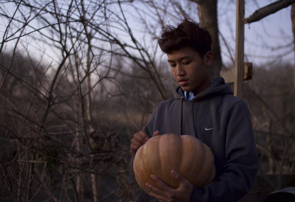Eh Kaw shows off a pumpkin he grew in a field not far from his apartment