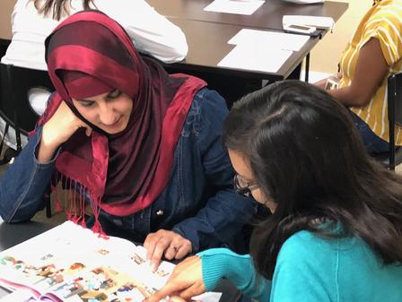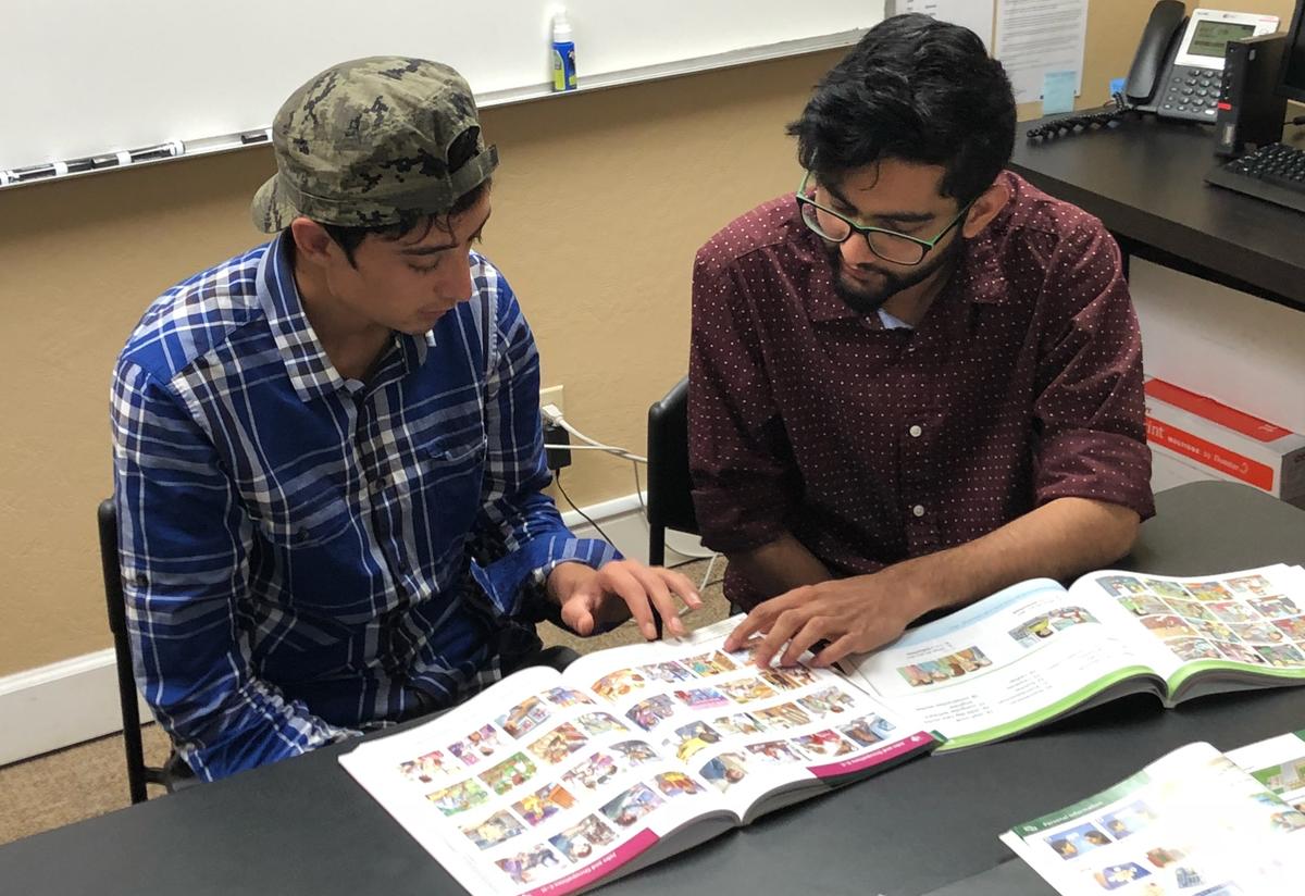 IRC volunteer Jay Dave, right, practices English vocabulary with an IRC client during Love Turlock on May 19.