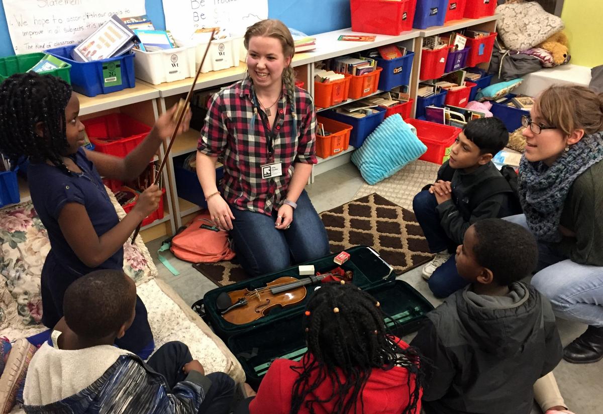 Allie (center) working with newcomer students in the IRC's elementary after-school program.