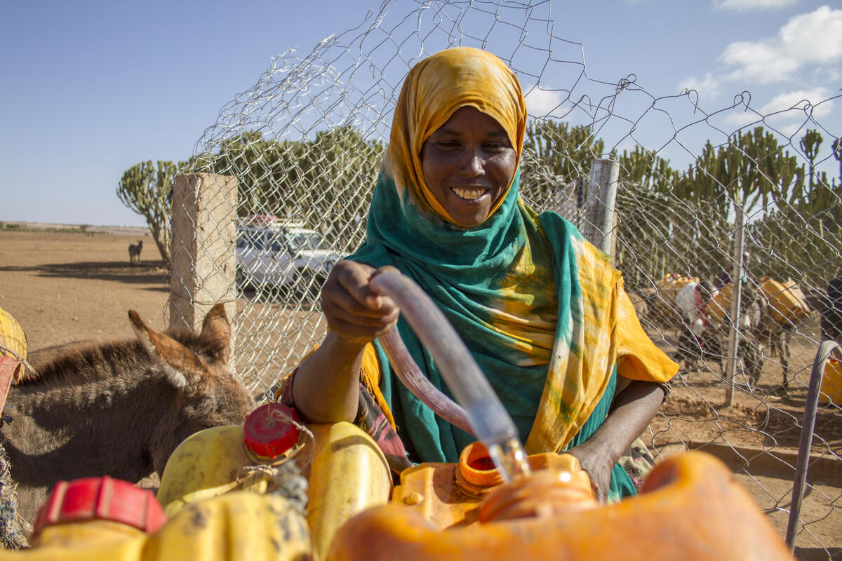 A woman fills a jerry can from a tap, part of a water system the IRC installed in Ethiopia.