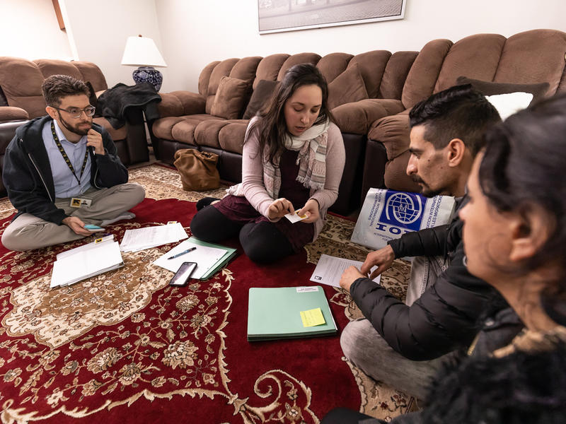 IRC caseworkers Qais Nayab and Sarah Conklin guide the Moradi family through initial paperwork as newcomers in America before they are taken to their apartment.