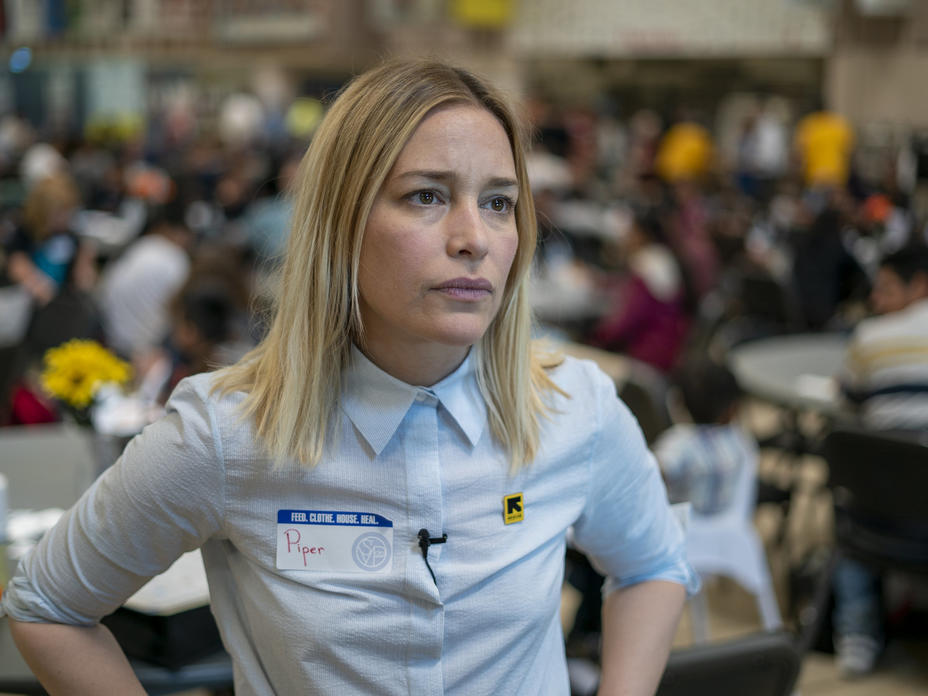 At the IRC day center, Piper Perabo helped serve meals, played with children, and made phone calls to alert relatives left behind that their family members had found safety.