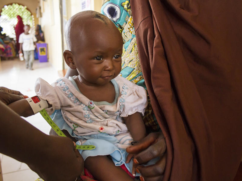 An IRC health worker examines the six-month-old daughter of Falmata Usman for signs of severe acute malnutrition. The IRC is providing urgently needed health care to families like Falmata's that have fled Boko Haram violence.