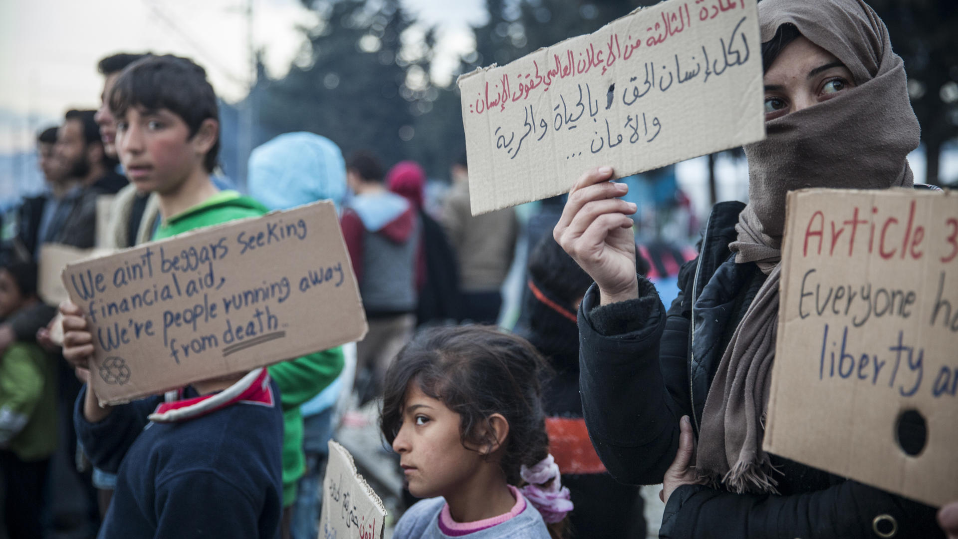Refugees hold a protest at the Idomeni border camp in northern Greece, where thousands remain stranded as Europe’s borders remain shut to them.