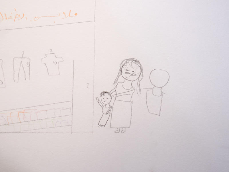 We went to buy new clothes for Eid. I remembered my mother; how we would buy new clothes for Eid together. I drew the children’s clothing shop, and the mother and her child, but when I started drawing myself, I couldn’t finish. I flipped the page and left the drawing incomplete.