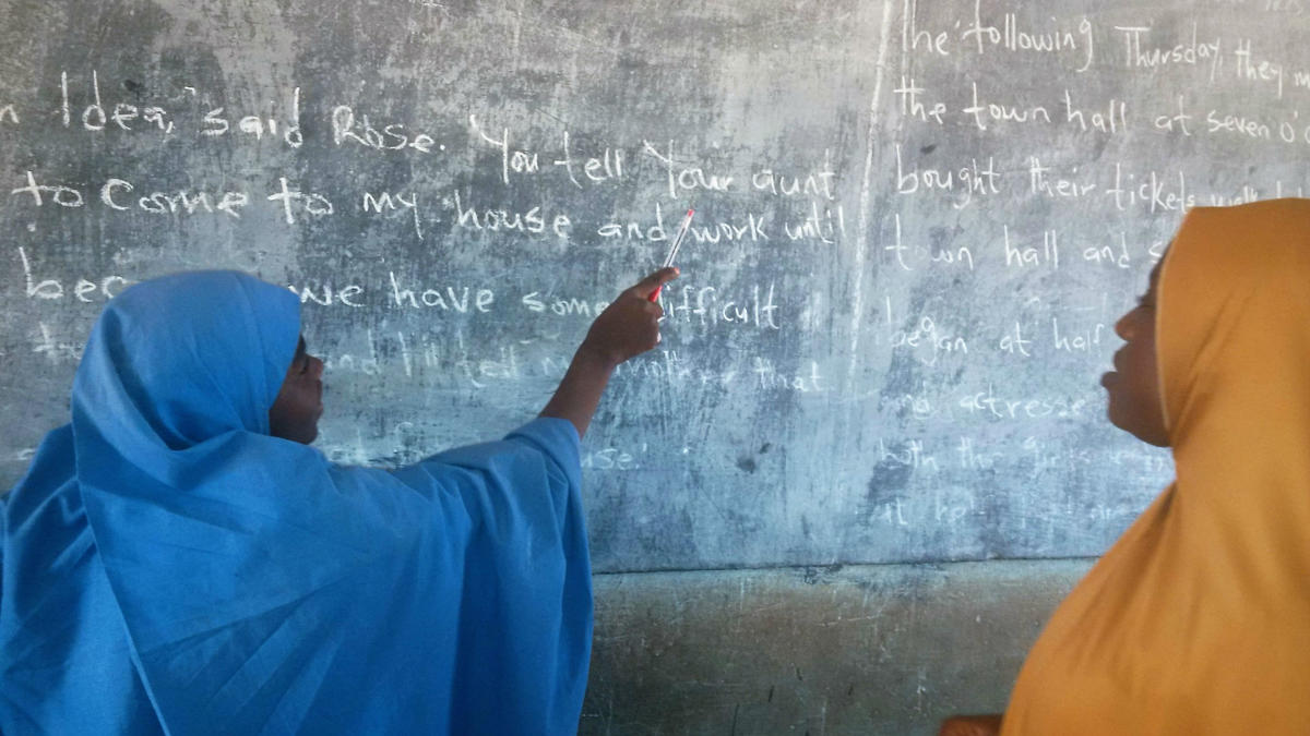 Fourteen-year-old Hauwa’u Alkali Bulama (left) was able to catch up on lessons she missed after her family fled Boko Haram.