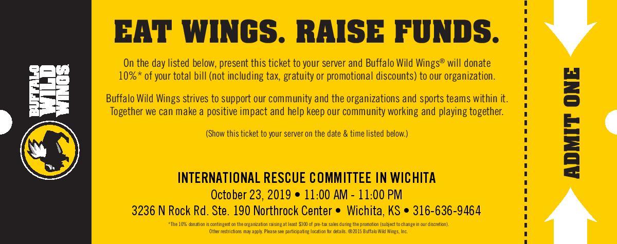 On October 23, Buffalo Wild Wings will give 10% of your total check to the IRC in Wichita to support refugees in our community. Simply mention to your server that you want to support refugees and the IRC. This offer is good all day on Wednesday, October 23, but only at the K96 and Rock Road location.