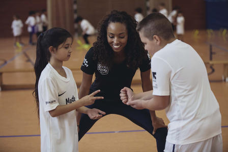 During the Q&A, the kids do not hold back with their questions: When do you get up in the morning? Do you go to the gym? How many hours a day do you play sports? Have you always wanted to become a footballer? When one of the girls asks how difficult it is to make a backward jump, Jacqueline is on board right away to give a live demonstration. Today it's all about these experiences: professional athletes show children how much fun exercising can be and that there is an athlete in each of them.