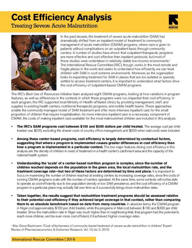 The International Rescue Committee (IRC), though, works in the most remote and fragile places in the world and seeks to understand how efficiently we can treat children with SAM in such extreme environments. Moreover, as the organization looks to expanding treatment for SAM in places that are too isolated or sparsely settled to access treatment centers, it is important to understand what factors drive the cost efficiency of outpatient-based CMAM programs.