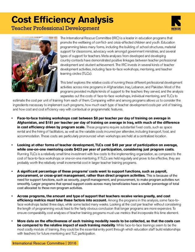 This brief explores the relative costs of running these different professional development activities across nine programs in Afghanistan, Iraq, Lebanon, and Pakistan. Most of the programs provided multiple kinds of support to the teachers they served, and the analysis separates out the costs of face-to-face workshops, individual mentoring, and TLCs to estimate the cost per unit of training from each of them. Comparing within and among programs allows us to consider the ingredients necessary to implement such programs, how much each type of teacher development costs per unit of training, and how cost and cost efficiency vary with contextual or programmatic features.