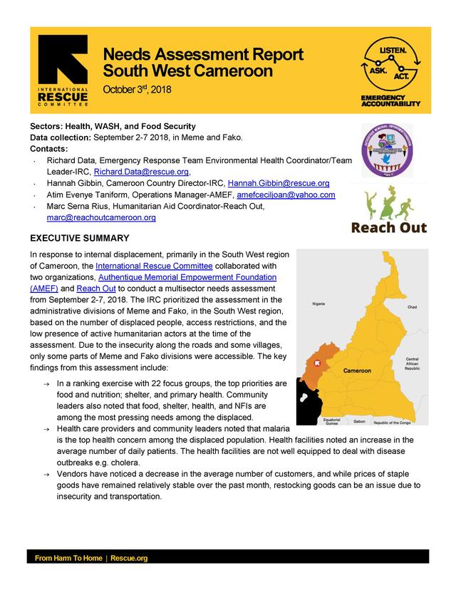 In response to internal displacement, primarily in the South West region of Cameroon, the International Rescue Committee collaborated with two organizations, Authentique Memorial Empowerment Foundation (AMEF) and Reach Out to conduct a multisector needs assessment from September 2-7, 2018. The IRC prioritized the assessment in the administrative divisions of Meme and Fako, in the South West region, based on the number of displaced people, access restrictions, and the low presence of active humanitarian actors at the time of the assessment. Due to the insecurity along the roads and some villages, only some parts of Meme and Fako divisions were accessible. The key findings from this assessment include: