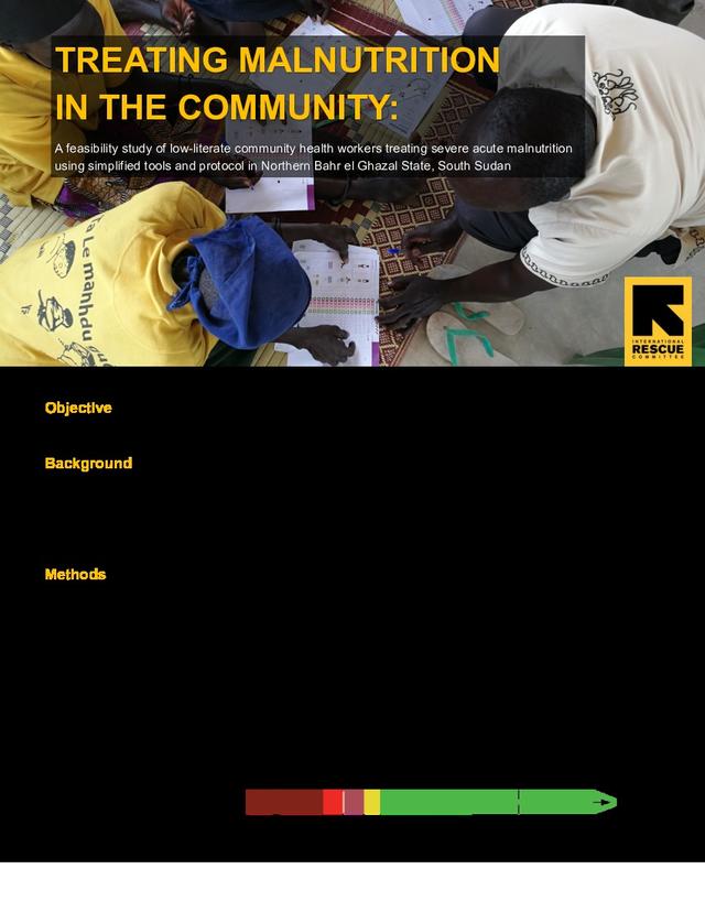 The International Rescue Committee (IRC) operates integrated Community Case Management (iCCM) programs in Northern Bahr el Ghazal that equips low-literate CHWs with the ability to treat common childhood diseases of pneumonia, diarrhea, and malaria. The IRC is conducting a feasibility study to determine whether treatment for uncomplicated SAM can be integrated into the iCCM protocol, with the use of job aids and tools that have been adapted for use by low- literate CHWs.