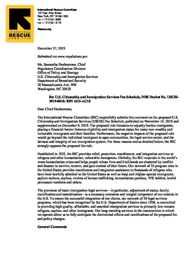The International Rescue Committee submitted a comment in response to the Department of Homeland Security’s (DHS) proposed changes to the U.S. Citizen and Immigration Services (USCIS) fee schedule, which was published in the Federal Register on November 14, 2019 and supplemented on December 9, 2019. As outlined in this document, the IRC strongly opposes the proposed changes to the fee schedule. These proposed changes would disproportionately harm low-income immigrants by creating financial barriers to the progress of an immigrant’s integration in the U.S., delaying or even preventing status that is critical to safety, security and protection.