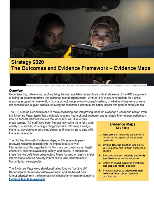 The Evidence Maps are available for reference and use by both IRC staff and external actors. IRC staff will always be able to find the most up-to-date versions of the Maps in the IRC2020 portal on the ‘Outcomes and Evidence’ page. External actors can use the following links to access the IRC’s Evidence Maps: