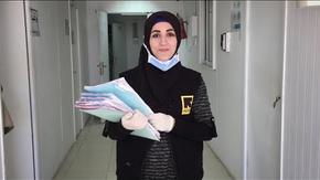 An IRC midwife in Bangladesh, wearing a mask, face shield and protective suit, reads the blood pressure of a patient whose face is covered by a veil to guard against COVID-19.