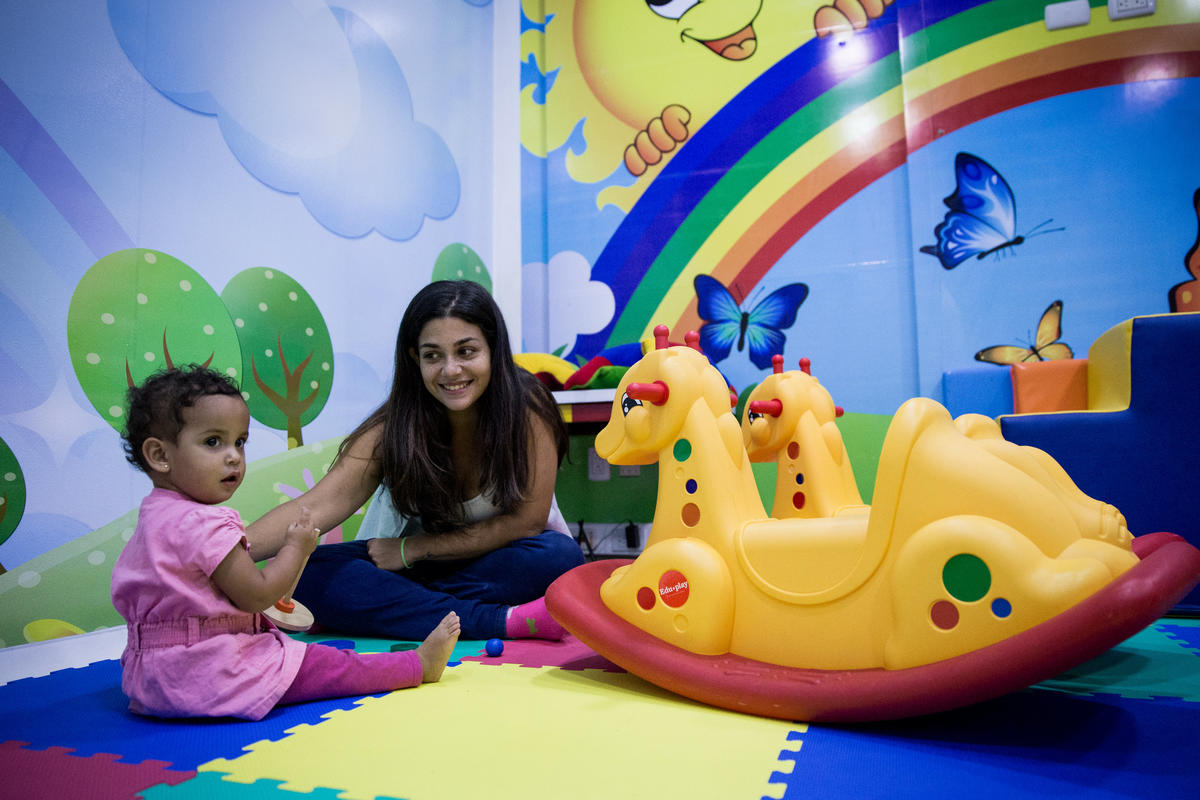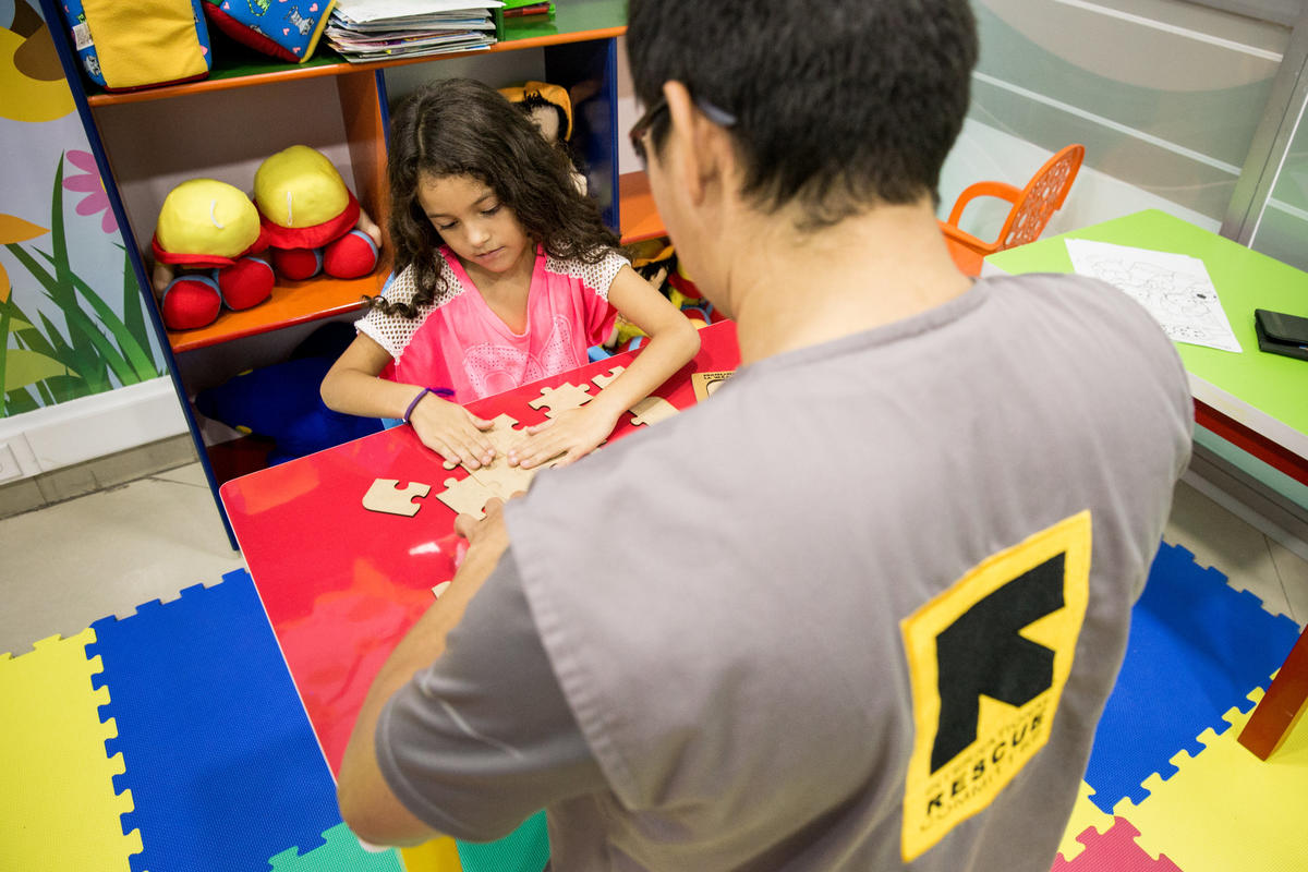 Andrea's older daughter, 9, works on a puzzle at the IRC's care center in Cúcuta while her mother meets with IRC staff. In a few months she will start school, where her mother hopes she'll make friends.