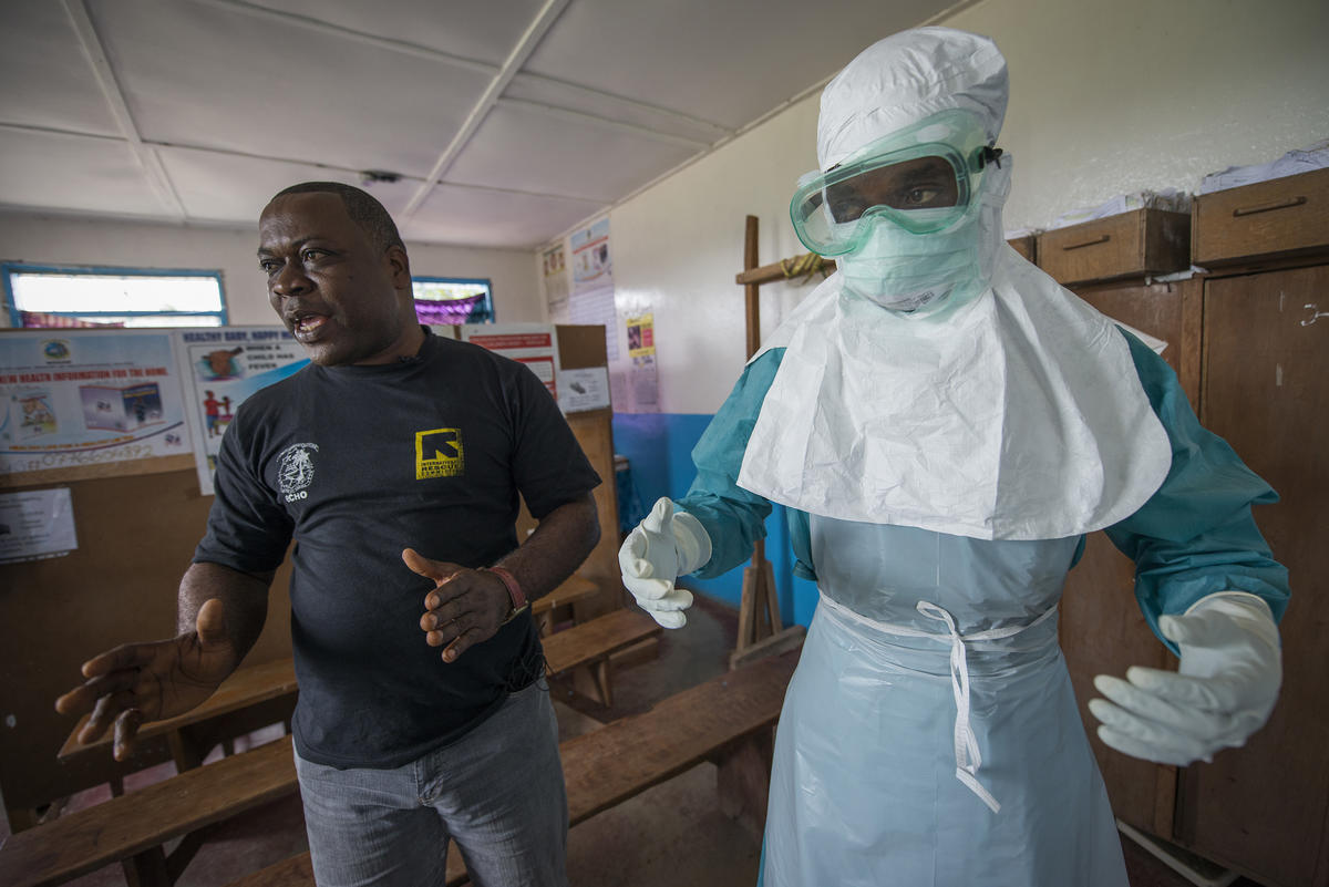 Most new Ebola cases occurred among health workers and people who were taking care of sick relatives. Here, Emmanuel Boyah, IRC’s health manager in Lofa County, trains local health workers in the use of protective clothing. Photo: Peter Biro/IRC