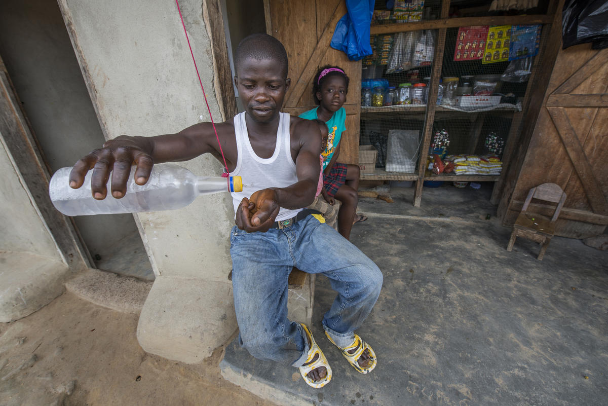 A shopkeeper washes his hands in chlorine solution in Barkedu, an Ebola-stricken village in Lofa County. Photo: Peter Biro/IRC