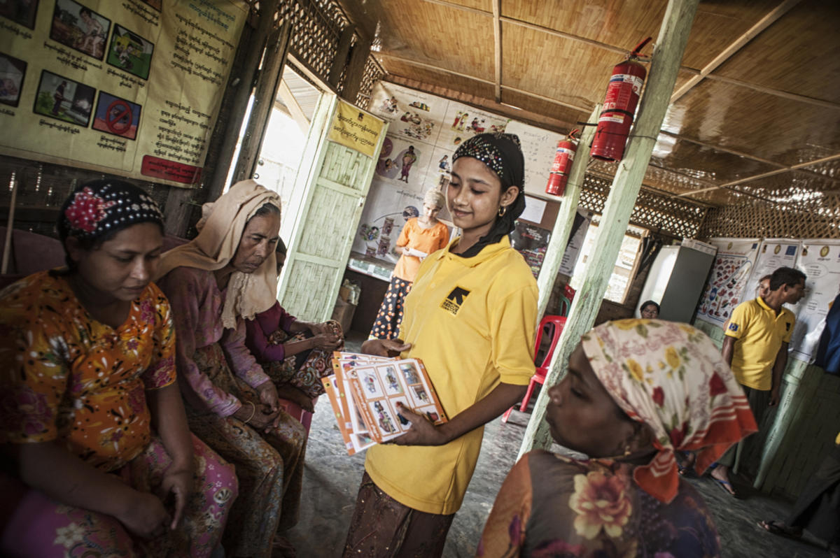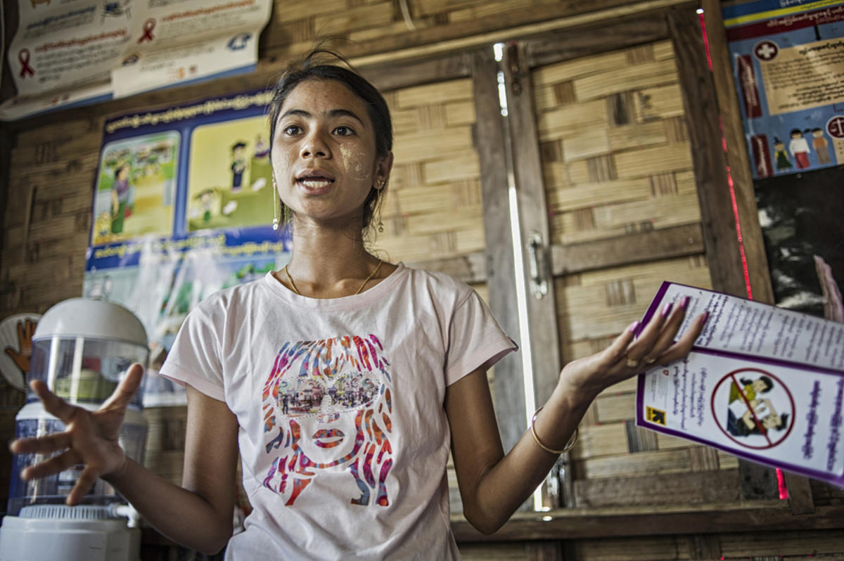 Ma Hla Hla May, 33, has been working as a community health worker with the IRC for 18 months in Da Paing Muslim camp. She registers patients and acts as translator, takes temperature and blood pressure, facilitates education sessions, and provides support for government immunization efforts.