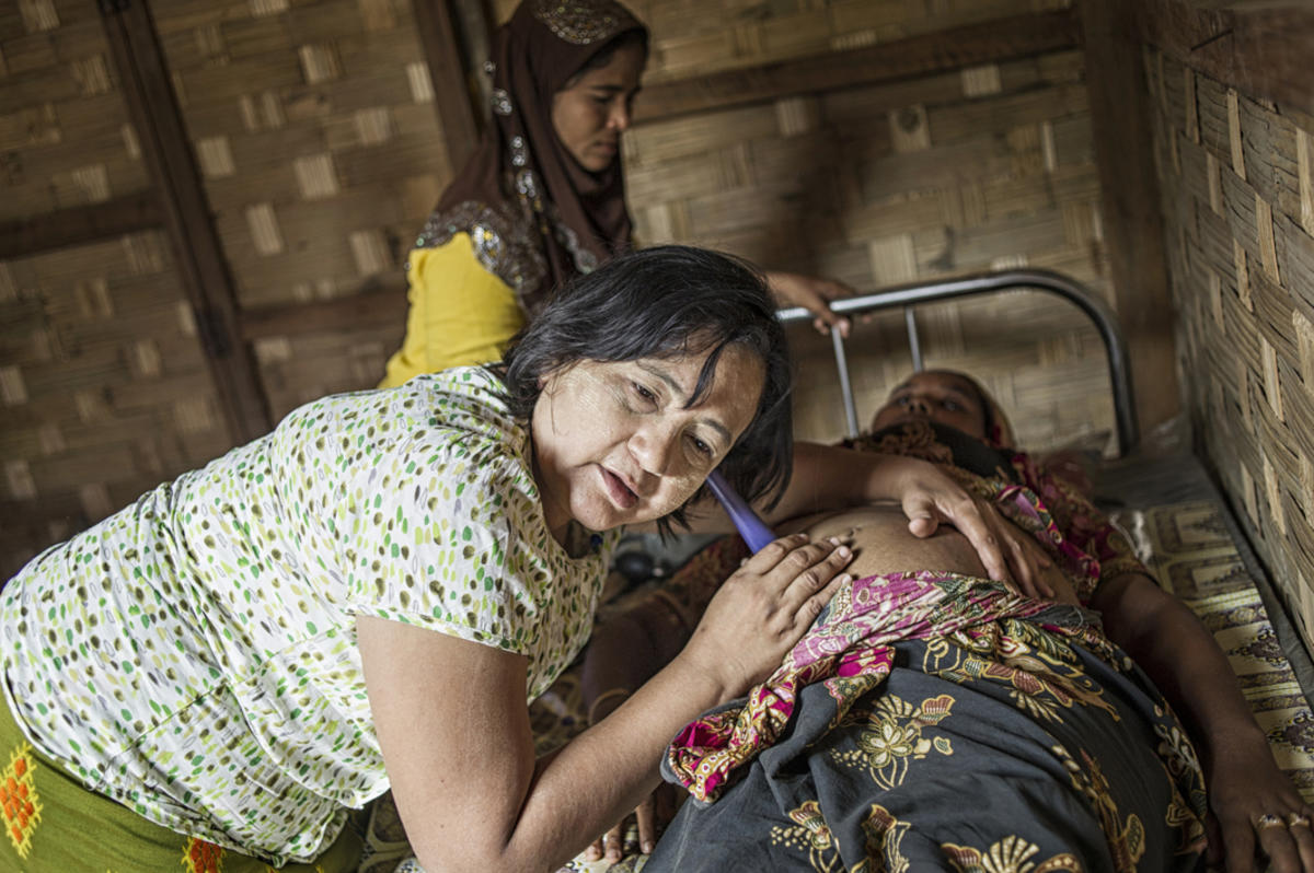 A clinic health worker gives an expectant mother a check-up. Ma Hla Hla May’s favorite part of her job is assisting with reproductive health work. “I like taking care of pregnant women,” she says. “I enjoy doing my job every day because I enjoy helping the community.”