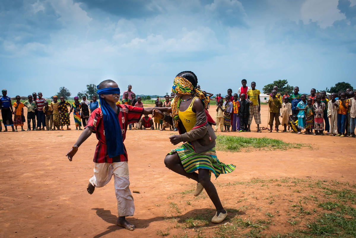 Children in the Central African Republic village of Koui play a blindfold game to help them bond with their peers and rebuild trust. This is just one of many healing activities – including sports, storytelling and dance – we provide for children in conflict zones. Photo: David Belluz/IRC