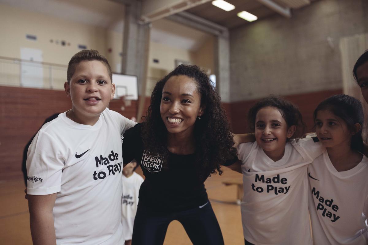 Children at Löwenzahn Primary School in Berlin-Neukölln met German athletes Jacqueline Otchere (center) and Maximilian Mittelstädt on Sep. 26 where they played soccer and other games.