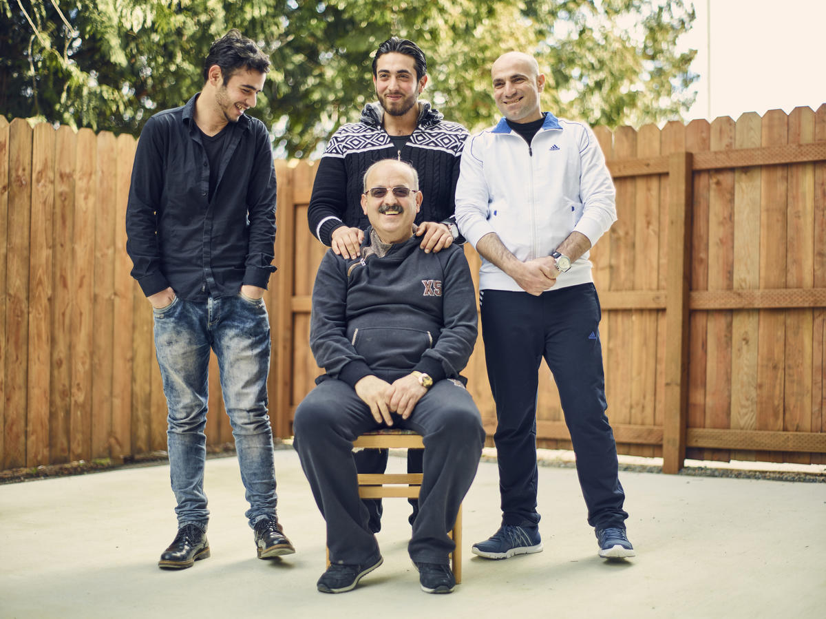 Ahmed (center) with his sons Mohamed and Walid and son-in-law Abdulmalik at their apartment in Tukwila.
