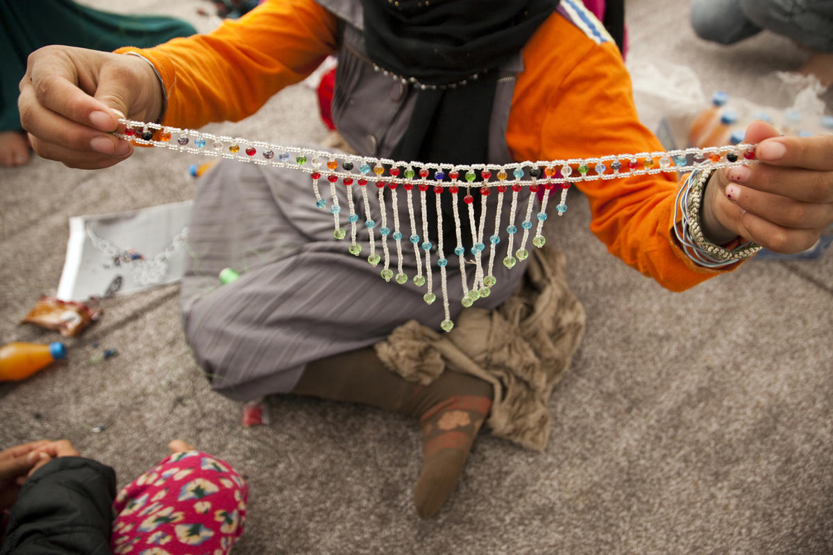“If we stay in our tents, we just think about what happened to us. When we come here, we learn and get to know each other,” says one teen as she threads red beads for a necklace. “For some girls, this is the first time in two years they are seeing and playing with other girls,” says Suzan. Photo: Rachel Howard/IRC