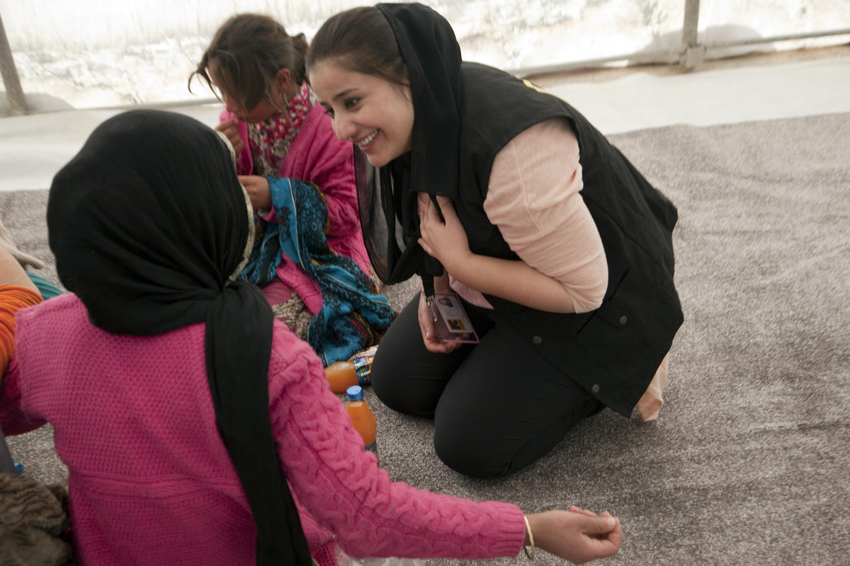 Suzan Hasan, a clinical social worker leading the IRC’s mobile emergency response team in Zelikan, explains: “Women tend to stay in the tents. They don’t trust the outside, they are still afraid for their safety. Usually only men and kids are outside.” Photo: Theresa Breuer/IRC