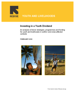 In recent years, there has been growing donor momentum around youth-focussed programming with a focus on the role of youth in social, economic and political development, especially in conflict affected countries. However, there is a lack of detailed information about donor policies and strategies and whether and how these strategies have been matched by an increase in funding and specific programming to meet youth needs. The International Rescue Committee commissioned this report to analyse key trends in donor strategies, programmes and funding to meet the needs of youth (aged 15-24) in conflict- and disaster-affected countries, with a specific focus on youth livelihoods development. The report is based on an in-depth desk-based review of available donor policy documents, programme and project information sourced from donor websites or staff members, as well as interviews with donor representatives. It focuses on the major public sector donors that have worked on, with and for youth over the last decade. Annex A provides information on the policies, strategies and programming of individual, bilateral and multilateral donors